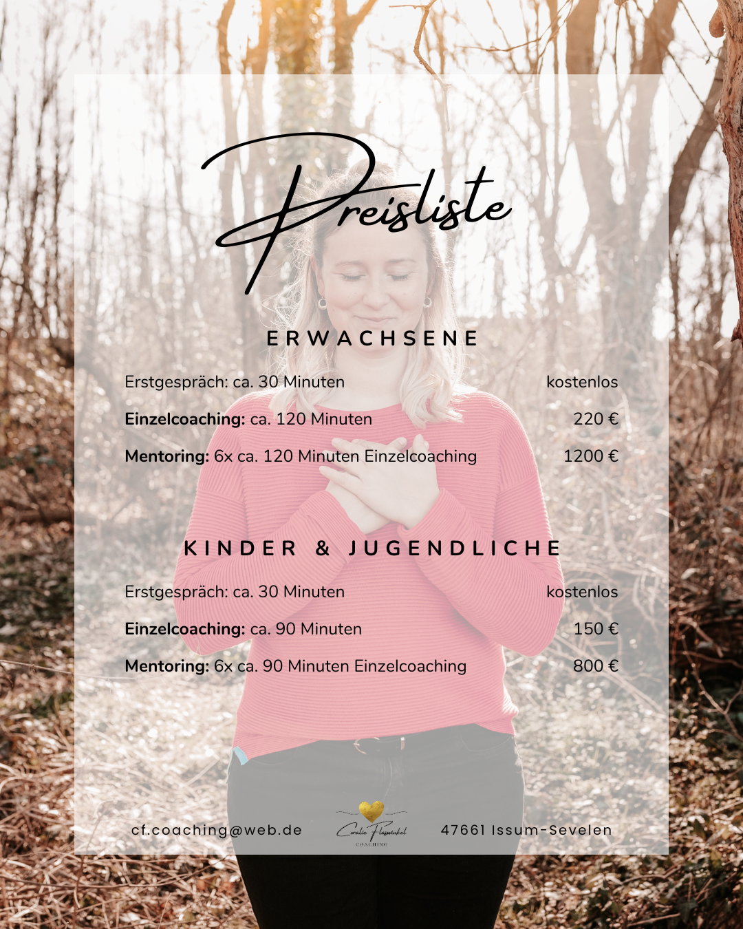 Coralie begegnet mir mit außergewöhnlicher Wertschätzung. Sie nimmt mich genau so an, wie ich in diesem Moment da bin. Mit ihrer warmherzigen Art verbindet sie Fachlichkeit mit Persönlichkeit und schafft einen Raum, in dem Entwicklung möglich wird. Ich freue mich auf jedes weitere Coaching!